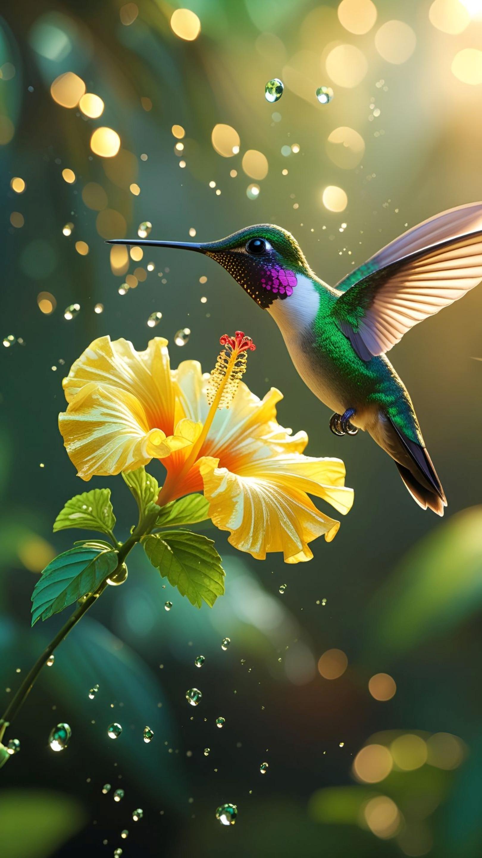 An awe-inspiring close-up capturing a shimmering hummingbird mid-hover, its emerald throat aglow and wings a blur, as it feeds from a vibrant yellow hibiscus.